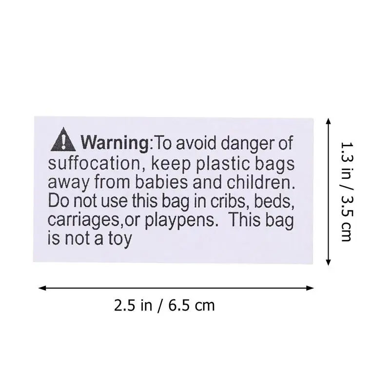 Do You Need Suffocation Warnings on Packaging in Your Craft Business? In general, suffocation warnings are required on bags that are 1 mil or less in thickness and have an opening of 5 inches or more. Suffocation warnings can be preprinted on the bag or attached with a label. Warnings are generally not required on outer packaging (like a poly mailer) because it is usually thicker than 1 mil. Suffocation Warning Label - Walmart Eucatus Super Adhesive Suffocation Warning Stickers 3 Pack. Bulk (1,500) Perforated 2 x 2 Self-Adhesive, Child Choking Hazard Labels. PLASTIC BAG/ POLYBAG WARNING IN DIFFERENT LANGUAGES - Aeempire 4.1 English. WARNING: To avoid danger of suffocation, keep this plastic bag away from babies and children. Do not use this bag in cribs, beds, carriages, or playpens. This bag is not a toy. Suffocation Warning Labels - Etsy Suffocation Warning Labels - FREE SHIPPING! (684) $5.99 FREE shipping Amazon Warning Labels (6) $1.50 Suffocation Warning Clear Poly Bags (81) $15.99 FREE shipping warning bow safety stickers/ labels, small business, business packaging, business stationery, Packaging stickers, Safety stickers (654) $1.50